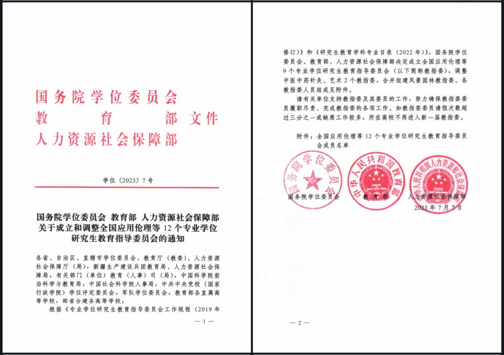 《关于成立和调整全国应用伦理等 12 个专业学位研究生教育指导委员会的通知》(学位﹝2023﹞7号)
