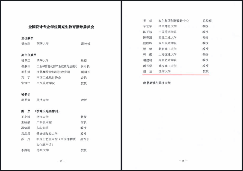 近日,国务院学位委员会、教育部、人力资源社会保障部联合下发《关于成立和调整全国应用伦理等 12 个专业学位研究生教育指导委员会的通知》(学位﹝2023﹞7号),决定成立食品与营养等9个专业学位研究生教育指导委员会(以下简称教指委),调整中医中药针灸、艺术2个教指委,合并组建风景园林教指委。我校陈卫教授当选全国食品与营养专业学位研究生教育指导委员会副主任委员,魏洁教授当选全国设计专业学位研究生教育指导委员会委员。这是我校教授首次当选全国专业学位研究生教育指导委员会副主任委员,也是我校首次两位教授同时当选该委员会委员,表明我校专业学位研究生教育能力和水平的有效提升。