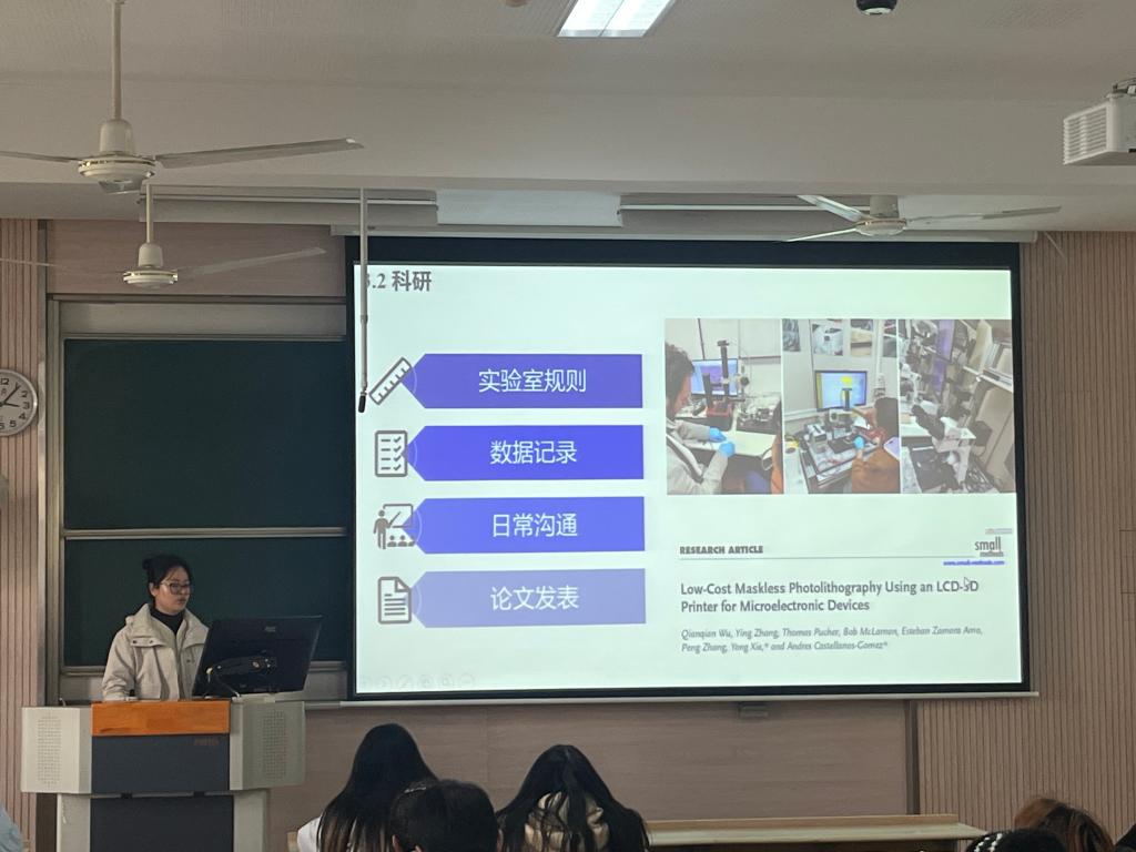 在经验分享环节,人工智能与计算机学院博士生程春阳结合自身申请经历与在英国的学习生活体验,向同学们分享了实用建议。他提到,留学申请需做好全面规划与时间管理,在保障研究成果产出的同时,要提前做好行前准备,为顺利适应海外学习生活打下坚实基础。物联网工程学院博士生吴倩倩则聚焦西班牙马德里材料研究所联培博士的申请过程,重点分享了与国外导师沟通、确定研究方向及获取offer的关键经验,并勉励同学们珍惜公派留学机会,在海外深造中锤炼严谨的学术素养与跨文化交流能力。